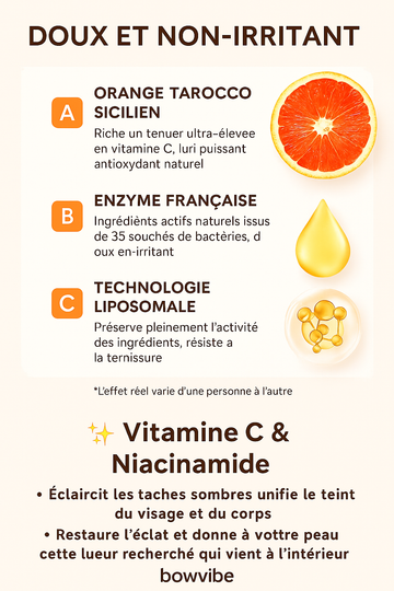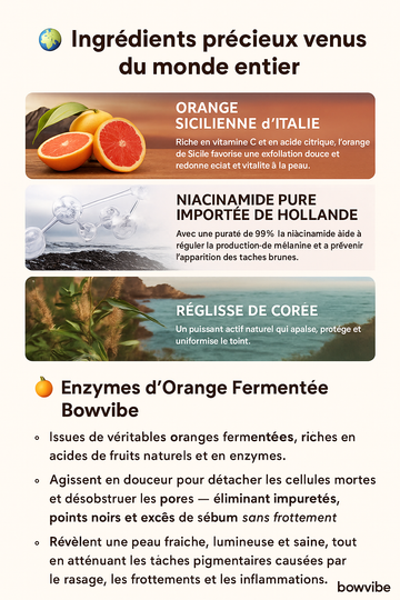C’est pourquoi Bowvibe a choisi une autre voie : une formule douce, inspirée de la fermentation naturelle, qui agit en profondeur sans douleur ni irritation pour révéler une peau plus lisse, uniforme et éclatante.
