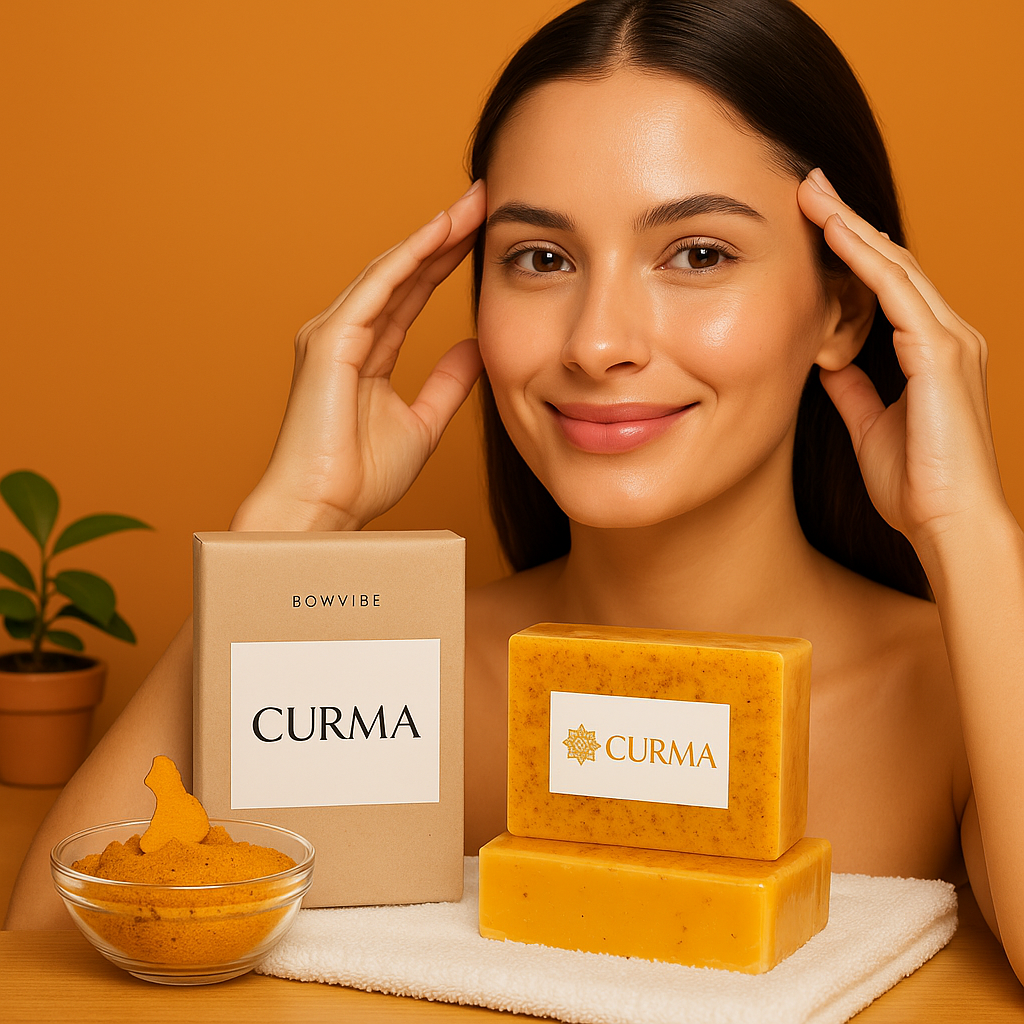 Savon Curma → matin et soir, fais mousser avec le sachet ou un gant exfoliant sur ton visage et ton corps, laisse poser 90 secondes, puis rince pour éliminer impuretés et taches.