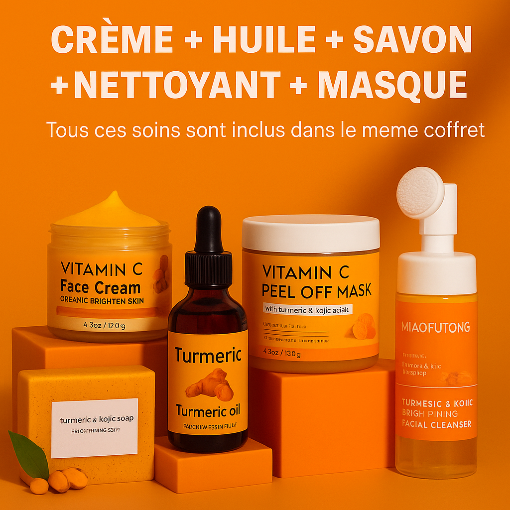 Formulé à base de curcuma et d’acide kojique, ce coffret réunit 5 essentiels qui agissent en synergie pour réduire les taches, purifier la peau et révéler un teint éclatant :