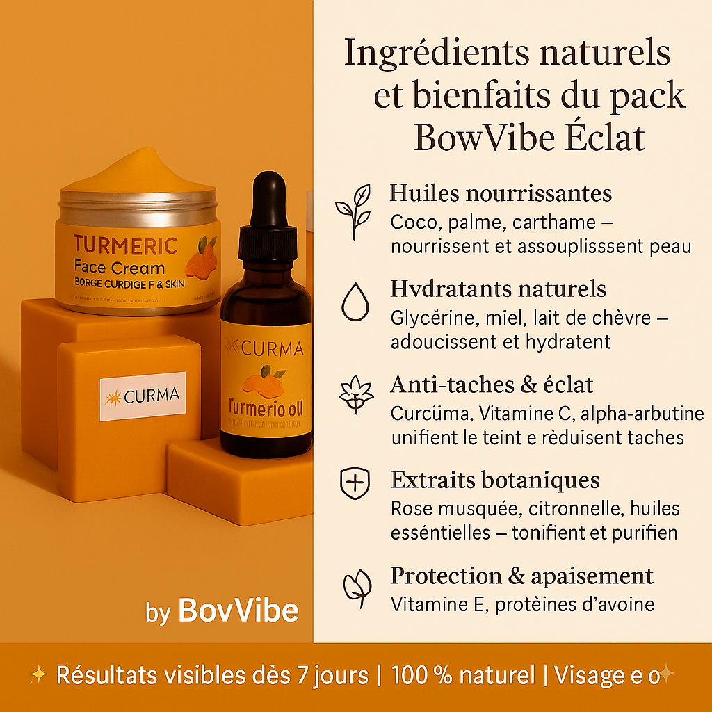 - Crème Visage Curcuma – hydrate intensément et ravive l’éclat naturel.