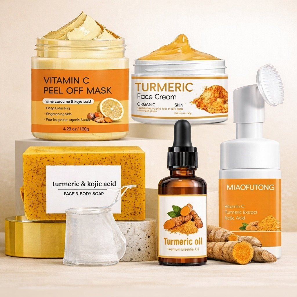 Formulé à base de curcuma et d’acide kojique, ce coffret réunit 5 essentiels qui agissent en synergie pour réduire les taches, purifier la peau et révéler un teint éclatant :